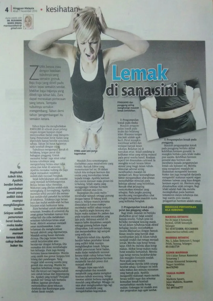 Tekaknya juga berasa loya dan mulut seolah-olah berbau biarpun telah berkumur lama. Zura bertekad untuk melakukan senaman. Sewaktu di universiti dia amat gemar bersukan namun kini setiap kali dia cuba melakukan senaman tubuhnya terasa amat berat. Aktiviti senaman menjadi amat membosankan. Lama kelamaan dia menghentikan banyak aktiviti yang digemarinya. Masalah sering bosan melanda dirinya. Dia juga berasa bosan untuk berjalan-jalan atau bersiar-siar dengan keluarga. Dia memaksa diri demi membahagiakan keluarga. Zura juga kurang bertemu kawan-kawannya. Wanita yang cantik dan gemar bergaya kini hilang dari pandangan. Yang tinggal ialah seorang wanita yang gemuk dan murung. Wanita itu bagaikan kehabisan tenaga. Setiap hari dia tercari-cari bagaimanakah cara untuk keluar dari kepompong itu. Apakah yang terjadi? Penyakit apakah ini? Setiap kali bertemu doktor, laporan perubatan menunjukkan paras tekanan darahnya dan kandungan gula dalam darah rendah. Masalah Zura sememangnya disebabkan paras metabolisme yang rendah. Banyak faktor yang mencetuskan hal ini. Di dalam tubuh kita terdapat hormon dan enzim yang menukarkan lemak kepada tenaga. Apabila hormon dan enzim merosot maka proses ini terhalang. Sebab utama yang mengganggu kelenjar hormon adalah tekanan atau stres. Bayangkan jika anda mahu membakar sampah setinggi gunung dengan hanya 10 batang anak mancis.